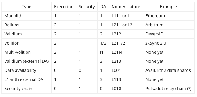 With composability between each layer, a plethora of blockchain architectures are available to developers. The above table (from here) combines settlement and consensus into a single security layer, indicates choices of chains by numbers 1, 2, 3, or N for multiple chains, and demonstrates the variety of architectural combinations through nomenclature and type.