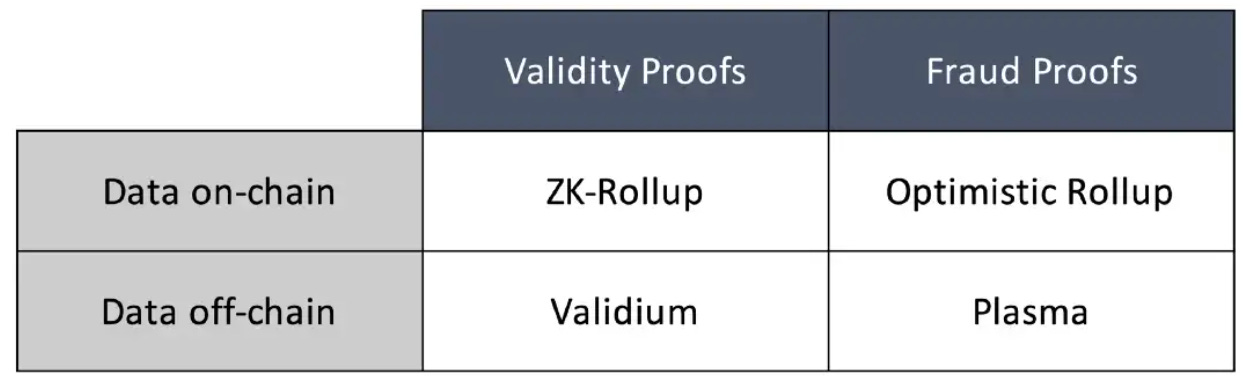 Amongst L2’s, there are four types of execution scalability solutions: Optimistic Rollup, Validity Rollup (aka ZK Rollups), Plasma, and Validium, which share comparable security levels to monolithic state transitions. There are two other types of L2-like execution scalability solutions: side chains and state channels, which are limited in security or scope, making them less desirable.